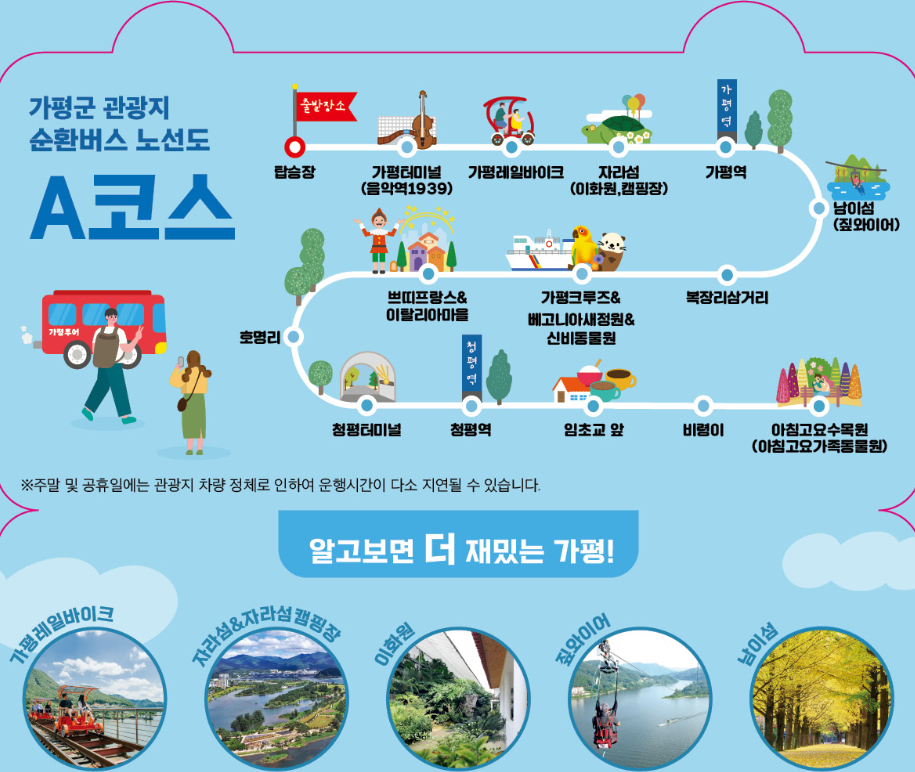 A코스는 가평의 주요 명소를 돌아보는 코스입니다. 탑승장은 가평역 근처에 위치하며, 코스 중에는 청평리버, 가평레일바이크, 자라섬 등이 포함되어 있습니다. 이 코스를 이용하면 가평의 다양한 매력을 느낄 수 있습니다.